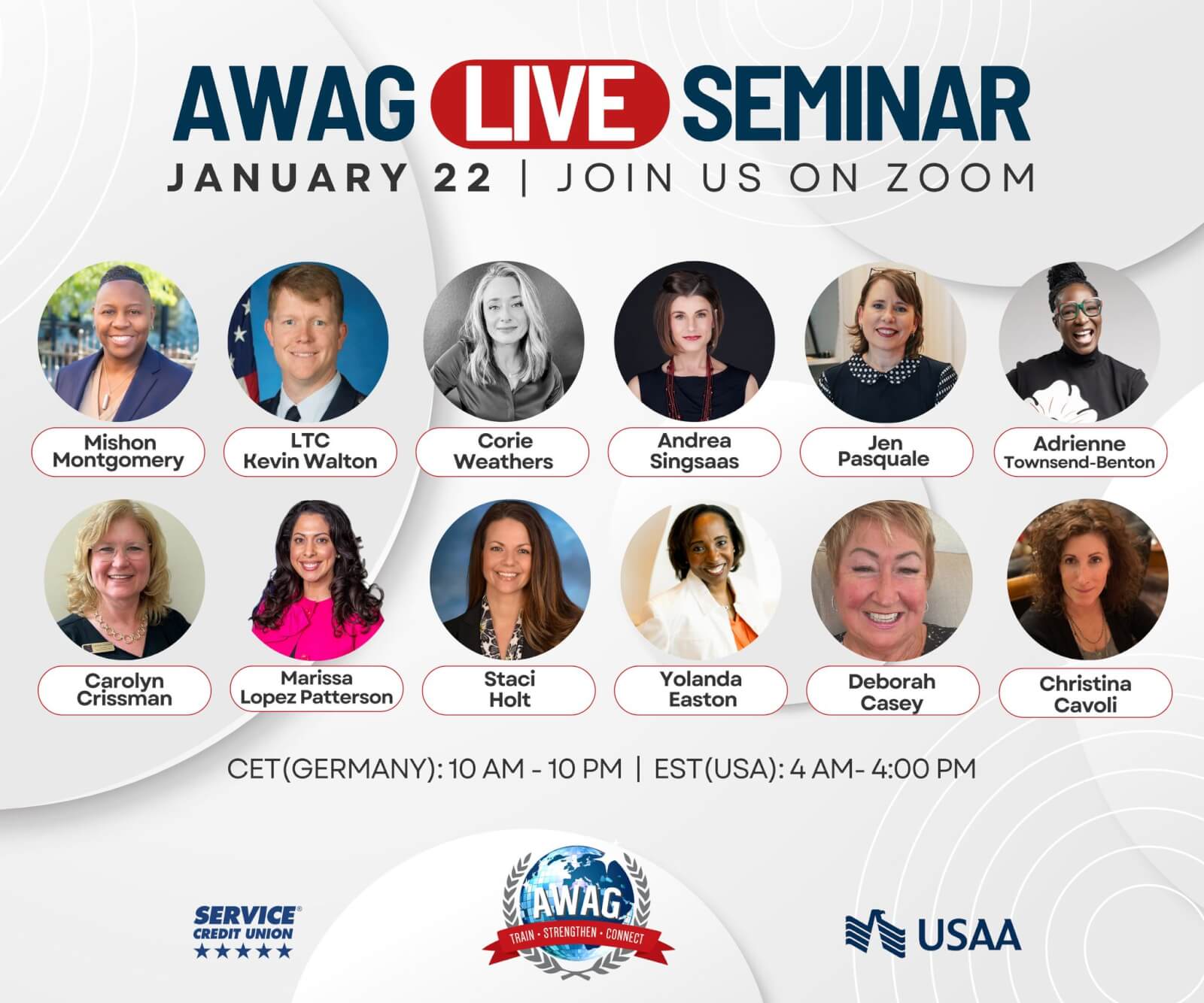 AWAG LIVE takes place January 22 on Zoom, with sessions running across multiple time zones and featuring speakers and panels focused on leadership, growth, and connection within the military community.