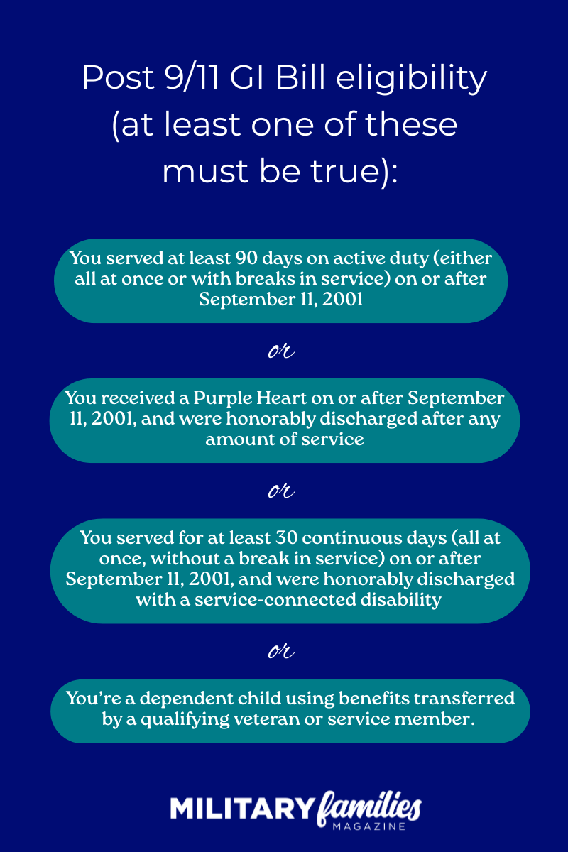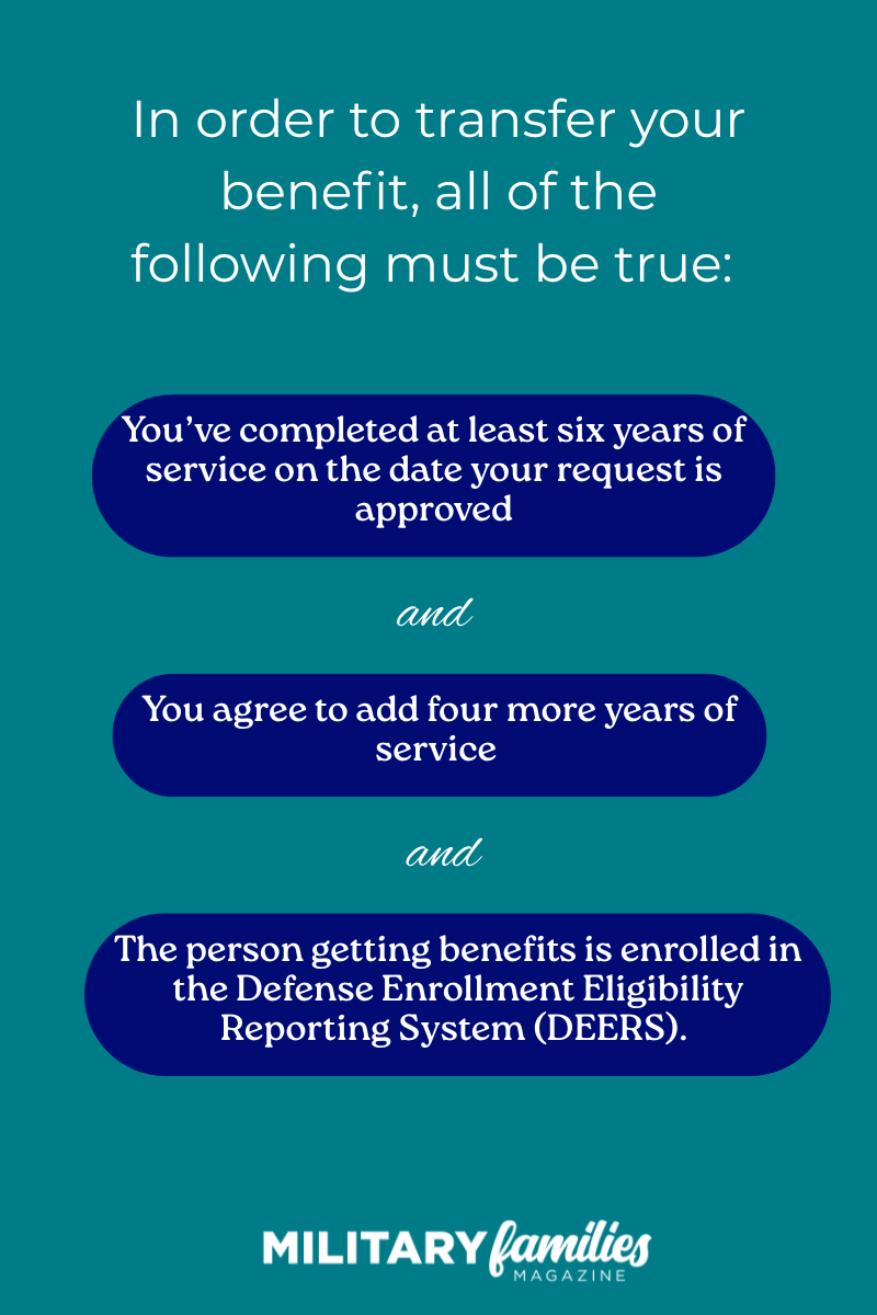 “If you’re a qualified service member, you can transfer all 36 months or a portion of your Post 9/11 GI Bill benefits to a spouse or child,” according to the VA website.